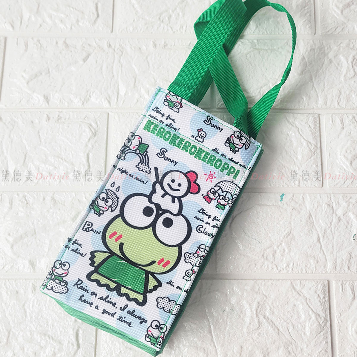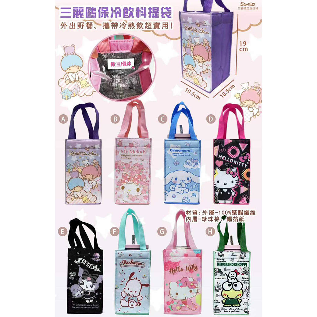 保冷飲料提袋-三麗鷗 SANRIO 正版授權 【款式】KITTY黑/KITTY粉/美樂蒂/庫洛米/大眼蛙/帕恰狗/雙子星/大耳狗 【尺寸】約19x10.5cm 【材質】聚酯纖維、錫箔紙、珍珠棉 【產地】中國(臺灣監製)