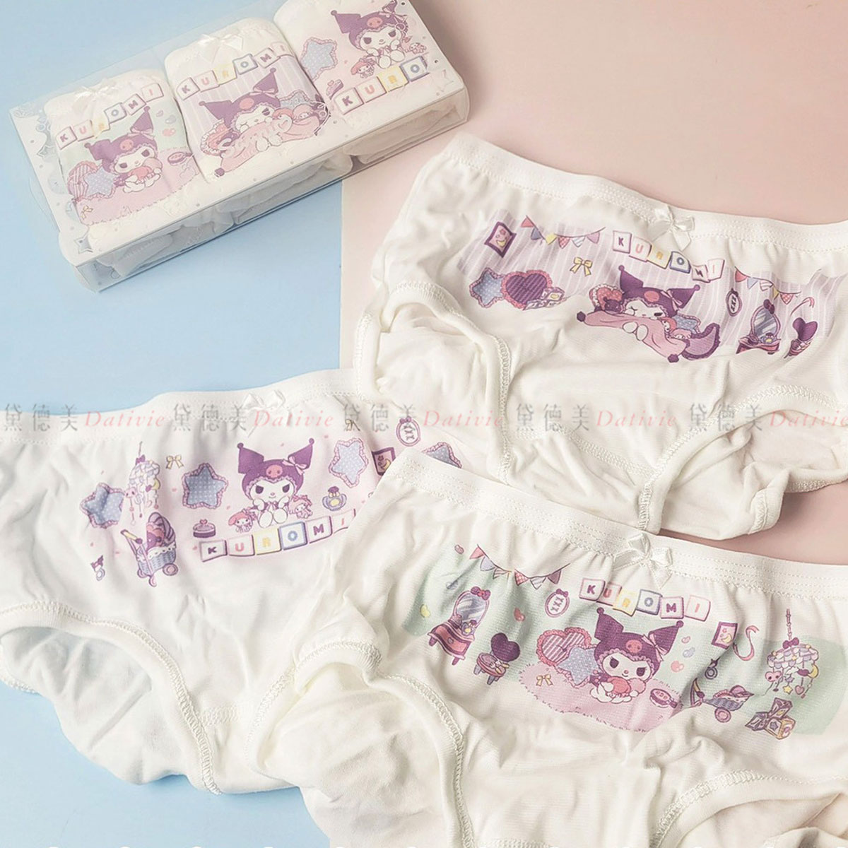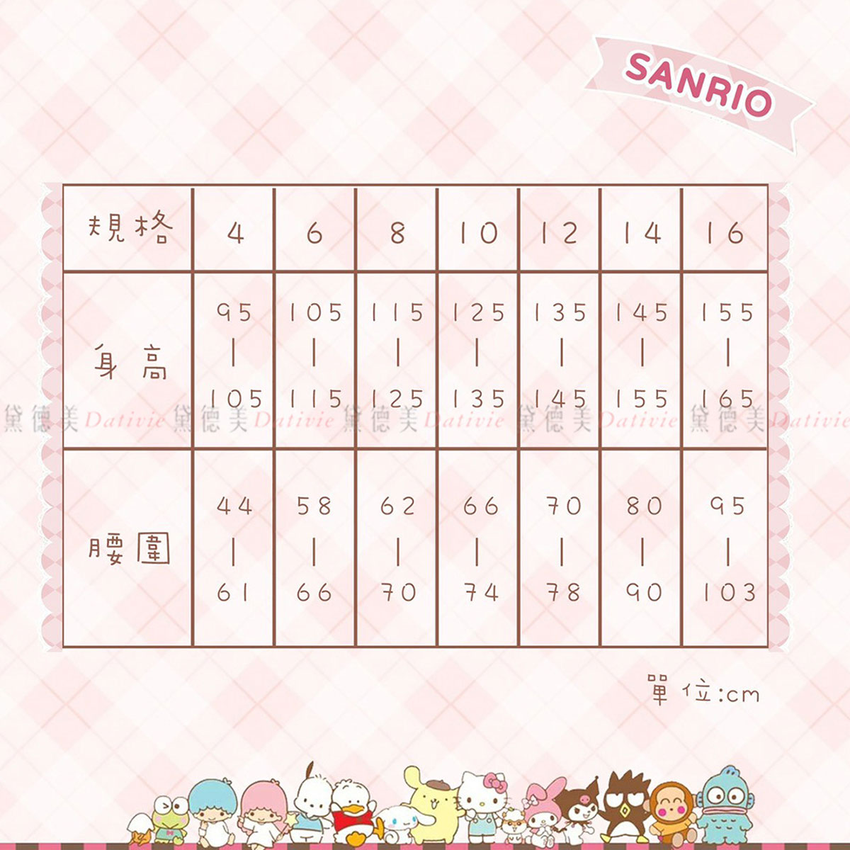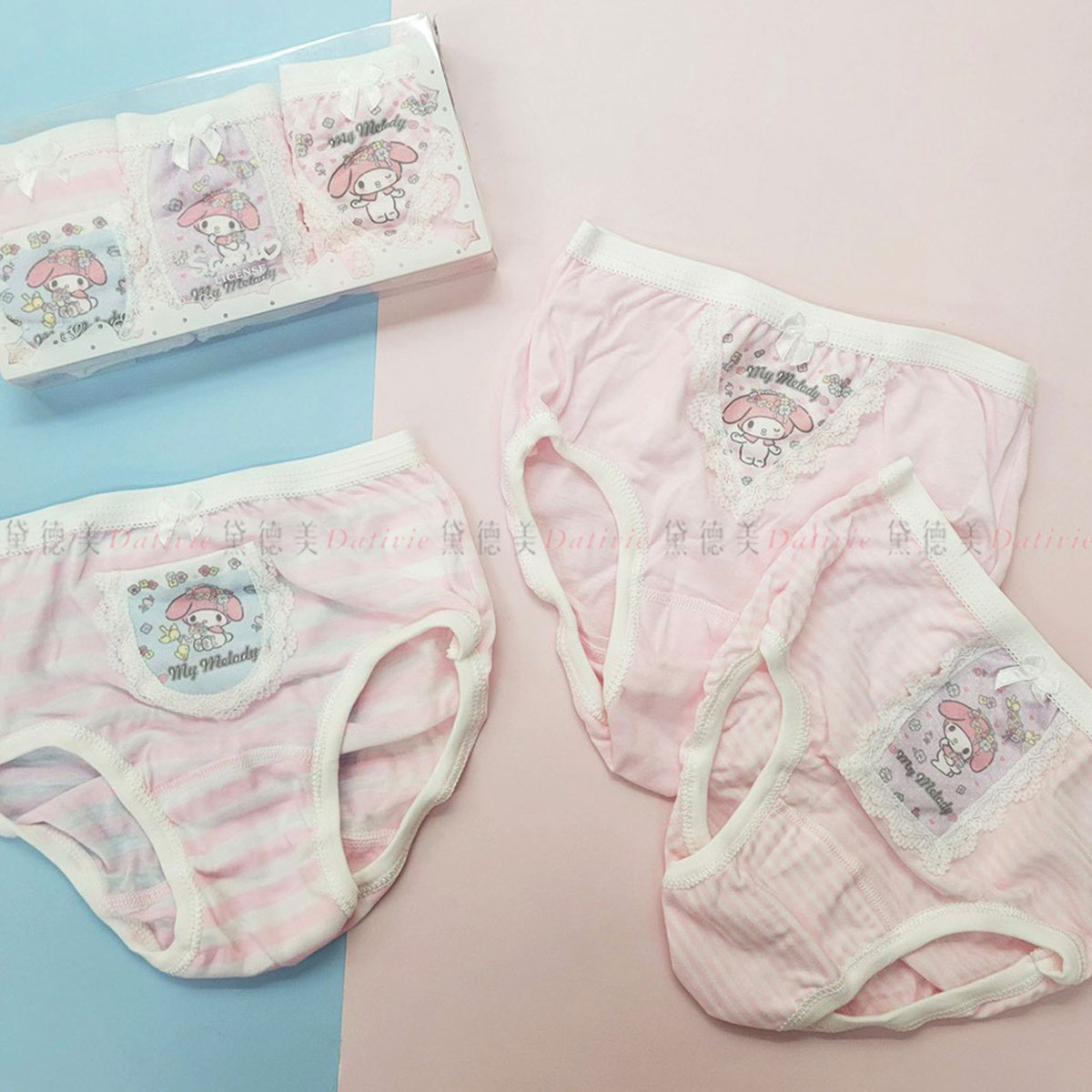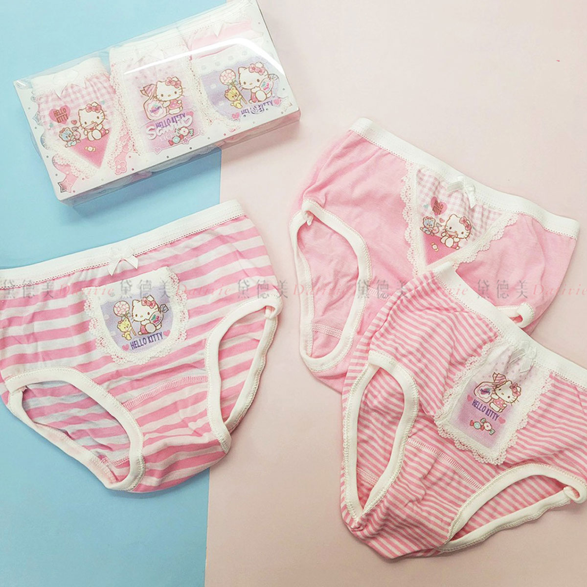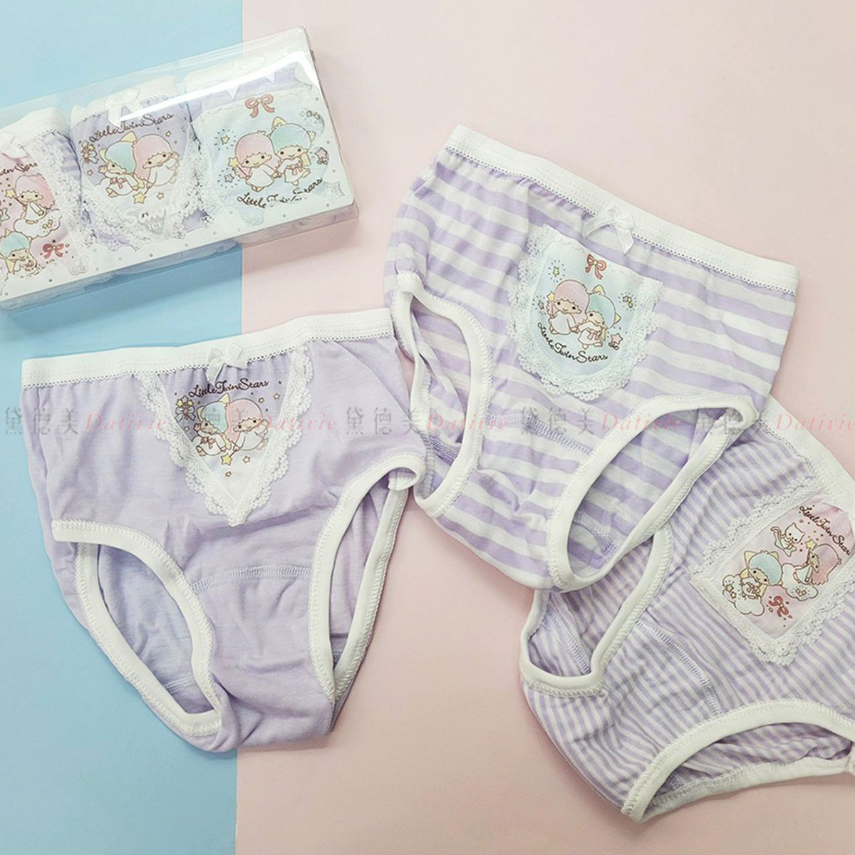 兒童內褲3入組- 三麗鷗 SANRIO 正版授權 【款式】KITTY / 美樂蒂 / 酷洛米 / 雙子星 【尺寸】尺寸表如圖所示 【內容】一盒3入 【材質】本布:棉100%、印花配布:棉35%、聚酯纖維(吸濕)65% 【產地】台灣