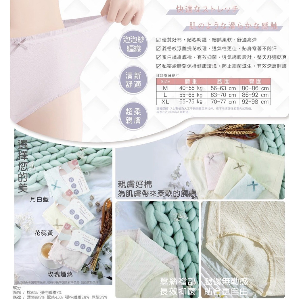 泡泡紗 浮紋 棉柔 親膚 內褲 【款式】月白藍/花蕊黃/玫瑰煙紫 【尺寸】M / L /XL (詳細如圖) 【材質】面料:棉93%、彈性纖維7%/底檔:嫘縈88.3%、尼龍3.3%、彈性纖維3.8%、蠶絲4.6% 【產地】中國(台灣監製)
